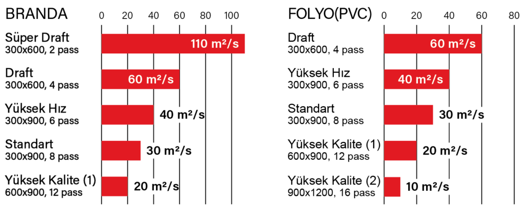 Gelişmiş çapraz dizilimli baskı kafaları sayesinde UJV55-320, branda üzerinde yüksek hızlı modda 60 m²/s baskı hızına ulaşır. Mükemmel baskı sonuçları ve üretkenlik sağlamak için çeşitli malzeme tiplerini ve baskı çözünürlüklerini karşılayan optimum profillere sahiptir.